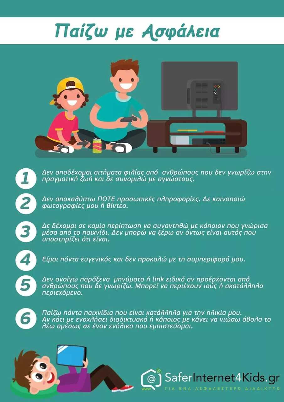 Τέλος, ευθύνη του ενήλικα κυρίως, είναι να δίνει τη δυνατότητα στους νεαρούς μας φίλους να παίζουν παιχνίδια που απευθύνονται στην ηλικία τους (υπάρχει σχετική ένδειξη σε κάθε παιχνίδι με το λεκτικό PEGI). Πάντοτε ρωτάμε για περίεργες συμπεριφορές και δείχνουμε ενδιαφέρον σε αυτά που μας λένε τα παιδιά μας και αφορούν το Online παιχνίδι τους. Κάτι μπορεί να ακούσουμε που εμείς θα το αναλύσουμε διαφορετικά, χωρίς την αθωότητα των παιδιών.