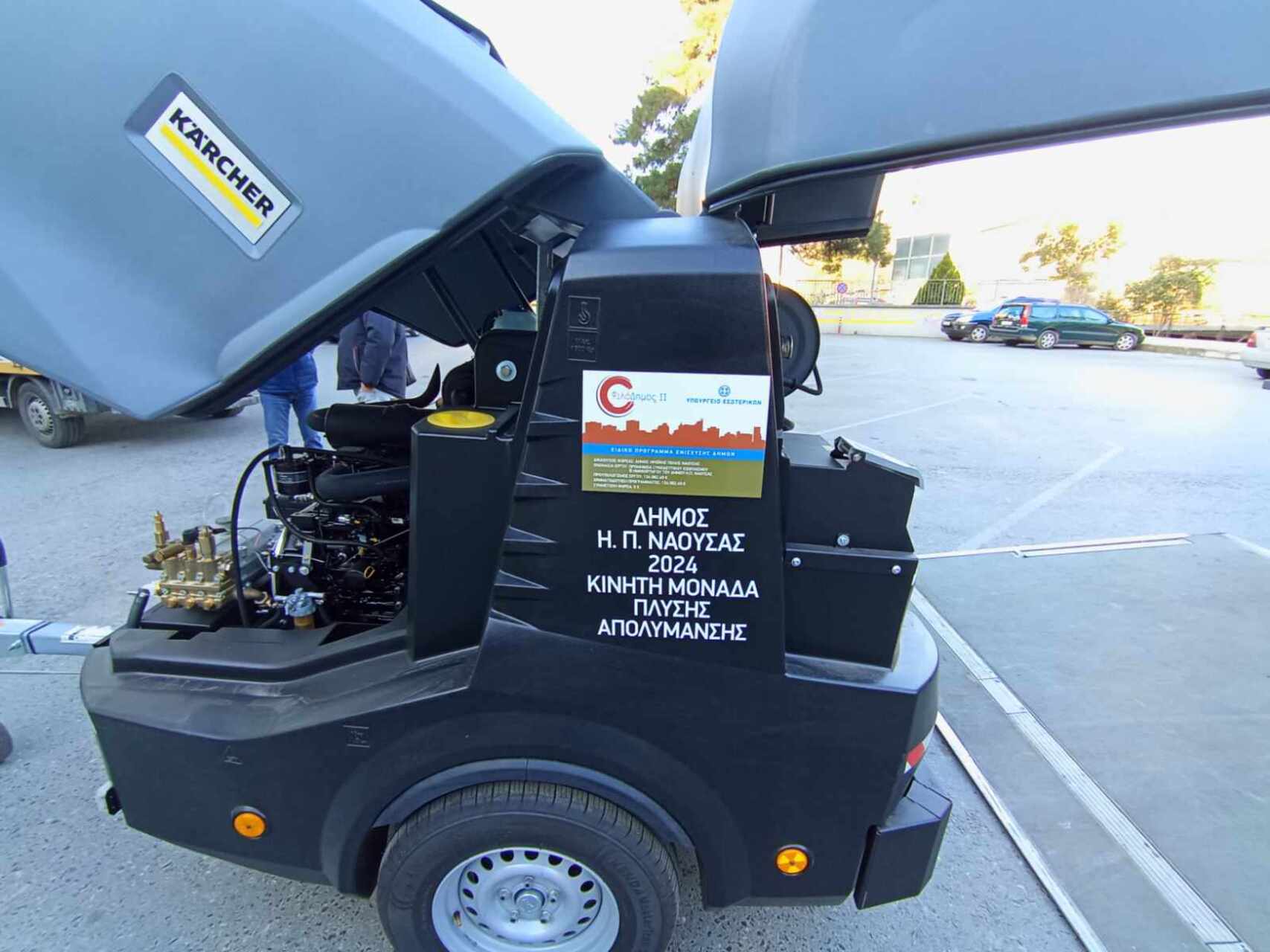 Πρόκειται για ένα αυτόνομο μηχάνημα 500 λίτρων πλύσης – απολύμανσης, εύκολο στη χρήση του, το οποίο θα χρησιμοποιηθεί σε κοινόχρηστους χώρους, πεζοδρόμια, πλακόστρωτα και για τον καθαρισμό του χώρου της λαϊκής αγοράς.