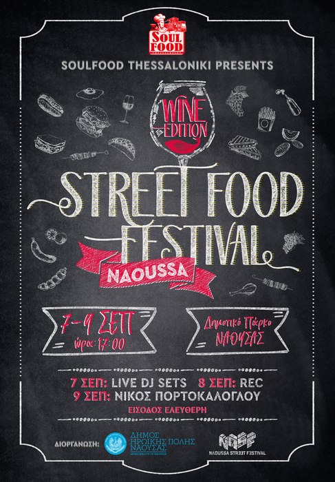 Στο πλαίσιο του «Naoussa Street Festival 2», ο Δήμος Ηρωικής Πόλης Νάουσας σε συνεργασία με την ομάδα «Soulfood Thessaloniki» (Streetfood & Beer Festival) και με οδηγό τη γεύση, παρουσιάζουν το «Naoussa street food festival-wine edition». Στην πρωτεύουσα του ξινόμαυρου από 7-9 Σεπτεμβρίου από τις 17:00 το απόγευμα, στο πλακόστρωτο του Δημοτικού Πάρκου της Νάουσας, ταξιδεύει η κουλτούρα φαγητού δρόμου.