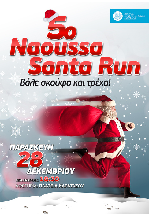 Ο Δήμος Ηρωικής Πόλης Νάουσας σε συνεργασία με πολιτιστικούς και αθλητικούς συλλόγους διοργανώνει για πέμπτη συνεχή χρονιά τον επιτυχημένο αγώνα δρόμου 5ο «Naoussa Santa Run» απόστασης περίπου 1.700 μ. που θα διεξαχθεί την Παρασκευή 28 Δεκεμβρίου 2018 και ώρα 18:30 το απόγευμα με αφετηρία την Πλατεία Καρατάσου.