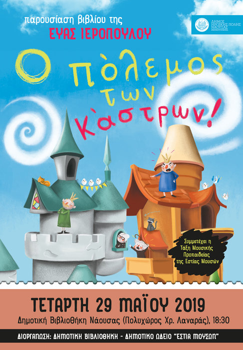 Το Δημοτικό Ωδείο Νάουσας "Εστία Μουσών" σε συνεργασία με τη Δημοτική Βιβλιοθήκη Νάουσας και τις εκδόσεις Τζιαμπίρη-Πυραμίδα διοργανώνουν εκδήλωση - παρουσίαση του νέου βιβλίου της Εύας Ιεροπούλου "Ο πόλεμος των κάστρων", την Τετάρτη 29 Μαΐου, στις 6.30 το απόγευμα στο αναγνωστήριο της Δημοτικής Βιβλιοθήκης Νάουσας (Πολυχώρος Πολιτισμού Χ. Λαναρά – Κτίριο Βέτλανς, 1ος όροφος).