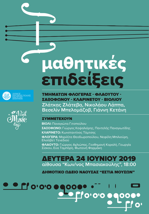 Το Δημοτικό Ωδείο Νάουσας «Εστία Μουσών», διοργανώνει τη Δευτέρα 24 Ιουνίου 2019 και ώρα 18 μ.μ. στην αίθουσα εκδηλώσεων Κων/νου Μπασιακούλη, την ετήσια μαθητική επίδειξη των τμημάτων Φλογέρας-Φλάουτου, Σαξόφωνου-Κλαρινέτου & Βιολιού των καθηγητών Ζλάτκας Ζλάτεβα, Νικόλαου Λάππα, Βεσελίν Μπελομάζοβ και Γιάννη Κετάνη. Είσοδος Ελεύθερη.