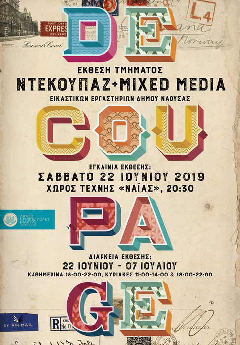 Το τμήμα ντεκουπάζ και μικτής τεχνικής (mixed media) των Εικαστικών Εργαστηρίων του Δήμου Νάουσας παρουσιάζει τις δημιουργίες των σπουδαστών του τμήματος το έτος 2018-2019 με τη διδασκαλία και επιμέλεια της εκπαιδεύτριας κ. Έλσας Δημησκή.