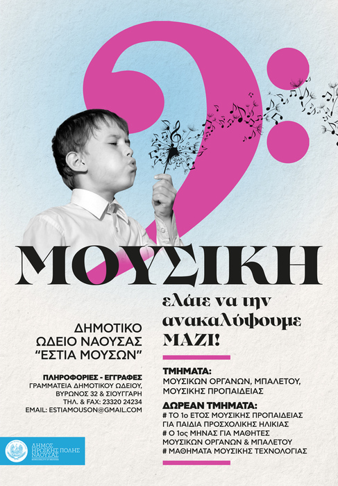 Από τις 1 Οκτωβρίου 2019 και για ένα μήνα το Δημοτικό Ωδείο Νάουσας δίνει την ευκαιρία σε όσους μαθητές και μαθήτριες, νέους και νέες, σκέφτονται στο άμεσο μέλλον να ξεκινήσουν την εκμάθηση ενός μουσικού οργάνου, να λάβουν δωρεάν αυτά τα πρώτα μαθήματα γνωριμίας με το
