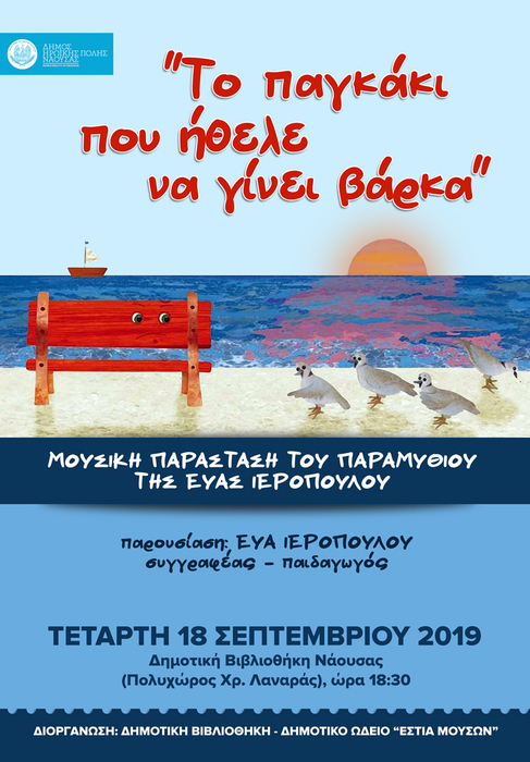 Το Δημοτικό Ωδείο Νάουσας «Εστία Μουσών» σε συνεργασία με τη Δημοτική Βιβλιοθήκη Νάουσας διοργανώνουν τη μουσική παράσταση του παραμυθιού «Το παγκάκι που ήθελε να γίνει βάρκα», την Τετάρτη 18 Σεπτεμβρίου 2019, στις 18:30 το απόγευμα στο αναγνωστήριο της Δημοτικής Βιβλιοθήκης Νάουσας (Πολυχώρος Πολιτισμού Χρ. Λαναράς – Κτίριο «Βέτλανς», 1ος όροφος).