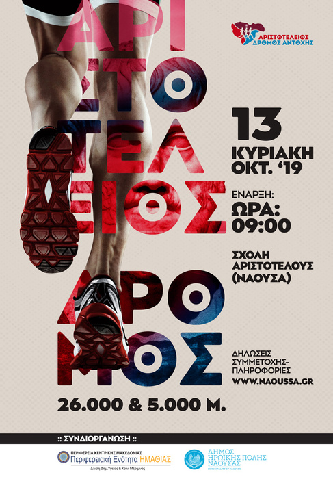Συνεχίζεται με μεγάλο ενδιαφέρον η υποβολή δηλώσεων συμμετοχής από τους δρομείς για τον αγώνα «3ος ΑΡΙΣΤΟΤΕΛΕΙΟΣ ΔΡΟΜΟΣ ΑΝΤΟΧΗΣ» συνολικής απόστασης 26 και 5 χλμ. αντίστοιχα που συνδιοργανώνουν η Περιφερειακή Ενότητα Ημαθίας, ο Δήμος Ηρωικής Πόλης Νάουσας, ο Σύνδεσμος Βετεράνων Αθλητών Στίβου Νάουσας, η Γ.Ε. Νάουσας με την τεχνική υποστήριξη της Ελληνικής Ομοσπονδίας Συλλόγων Λαϊκού Μαζικού Αθλητισμού - Υπεραποστάσεων, (Ε.Ο.Σ.Λ.Μ.Α.Υ.) Η εκκίνηση θα δοθεί την Κυριακή 13 Οκτωβρίου 2019 και ώρα 09:00 π.μ. στη Σχολή Αριστοτέλους και ο τερματισμός θα γίνει στο ίδιο σημείο.